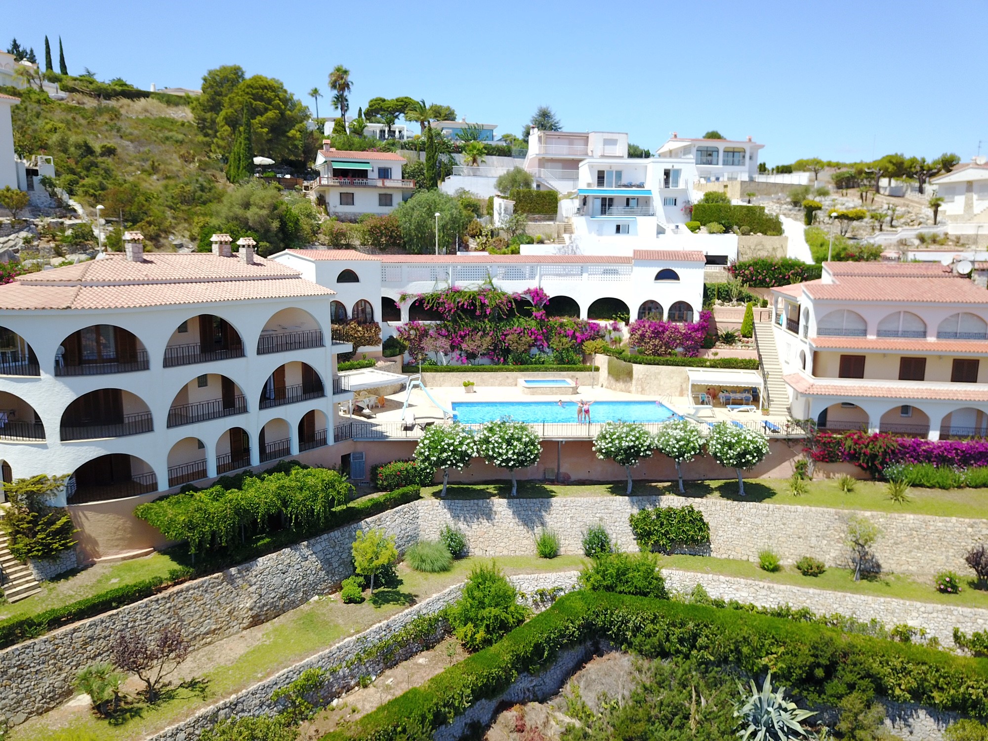 Todos los edificios están rodeados por jardines con riego automático. Debajo de las piscinas, hay jardines en terrazas, y la última terraza cuenta con un jardín de frutales. También hay un terreno de petanca.Superficie Total y Terreno Libre